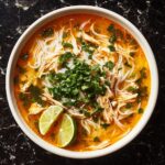 This Asian Chicken Noodle Soup is a comforting and flavorful dish perfect for any day. Featuring tender shredded chicken, delicate rice noodles, and a fragrant broth infused with garlic, ginger, soy sauce, and rice vinegar, this soup brings warm, vibrant Asian flavors to your bowl. Garnished with fresh green onions, cilantro, and lime wedges, it balances savory and fresh notes for a wholesome meal ready in just 35 minutes.