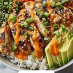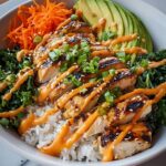 Now for the fun part: assembling your bowl! Divide the fragrant jasmine rice evenly into four bowls as your base. Top the rice with the beautifully cooked chicken, then pile on the fresh shredded carrots, cabbage, cucumber, green onions, and cilantro. Nestle diced avocado on top for a creamy, cooling balance to the spicy chicken. Finally, drizzle generously with the homemade bang bang sauce and finish with a sprinkle of sesame seeds and a dab of sriracha if you like it hot. The combination of colors and textures here makes this bowl almost too good to eat.