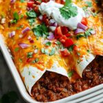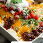 These Cheesy Ground Beef Enchiladas are a comforting and flavorful Mexican-inspired dish perfect for family dinners. Ground beef is simmered with tomatoes and spices, then wrapped in warm corn tortillas with a blend of Monterey Jack and cheddar cheese. Baked until bubbly and golden, they’re topped with enchilada sauce and finished with optional sour cream and fresh cilantro for a delicious, satisfying meal.