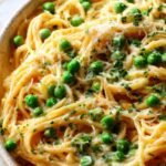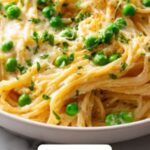 Add the frozen peas, chopped cooked chicken, and cooked spaghetti to your sauce bowl. Gently toss everything until the pasta is fully coated and the peas and chicken are evenly distributed. This ensures every bite has that perfect balance of tender chicken, sweet peas, and creamy sauce.