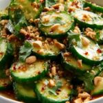 A refreshing and zesty Peanut & Chili Oil Cucumber Salad that combines crisp cucumbers with a spicy, tangy dressing and crunchy roasted peanuts for texture. Perfect as a quick appetizer or side dish, this salad offers a delightful balance of spicy, savory, and slightly sweet flavors in just 10 minutes.