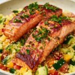Plate a generous scoop of the fluffy couscous base, top it with the dressed vegetables, and gently nestle your cooked salmon fillet on top or to the side. The textures and flavors mingling together here will give you that satisfying contrast of warm, flaky fish with cool, crisp veggies and soft, aromatic couscous.