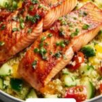 A vibrant and healthy Salmon and Couscous Bowl featuring perfectly seared salmon fillets served over fluffy couscous, complemented by fresh cucumber, cherry tomatoes, and red onion, all tossed in a zesty lemon Dijon dressing. This quick and easy meal comes together in just 30 minutes, making it perfect for a nutritious weeknight dinner.