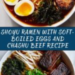 Divide the noodles evenly between two bowls. Ladle the hot shoyu broth generously over the noodles. Then, lovingly arrange your soft-boiled eggs, chashu beef slices, bean sprouts, green onions, and nori strips on top. Each element should shine but also harmonize to create the ultimate bowl of Shoyu Ramen with Soft-Boiled Eggs and Chashu Beef Recipe.